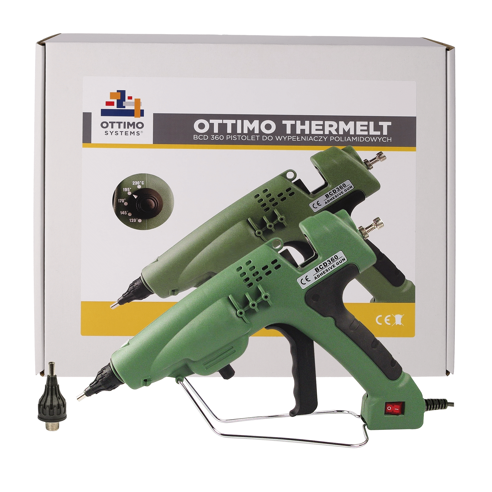 Przystosowany do pracy ciągłej, posiada praktyczny i stabilny uchwyt, wskaźnik regulacji temperatury, regulator ilości wypływającego materiału. Pistolet dostępny jest w 2 wersjach: