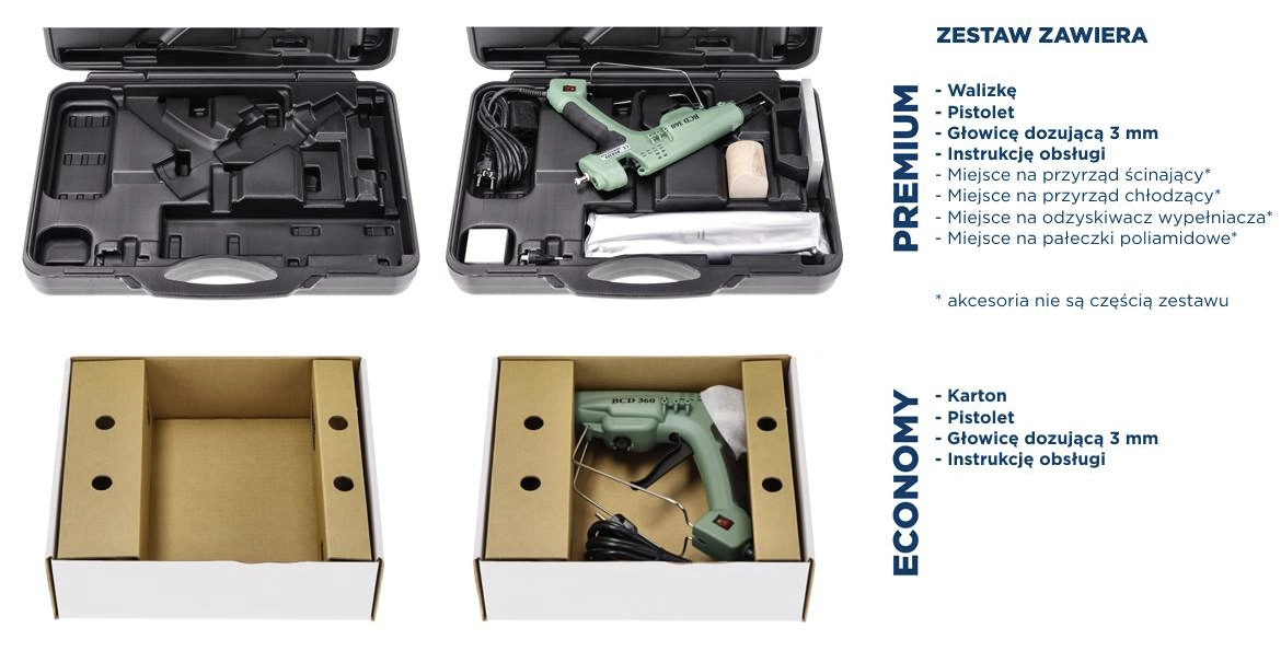 Pistolet na zasilanie akumulatorowe, do aplikacji wypełniaczy poliamidowych TH. Przystosowany do pracy ciągłej, posiada praktyczny i stabilny uchwyt, wskaźnik regulacji temperatury, regulator ilości wypływającego materiału. Przyrząd zapakowany jest w kartonowe pudełko. Opakowanie w wersji ECONOMY jest w pełni ekologiczne, nadaje się do łatwej utylizacji. Do produktu dołączona jest instrukcja obsługi. Pasujący adapter do baterii dostępny jest oddzielnie. Bateria nie jest częścią oferty.